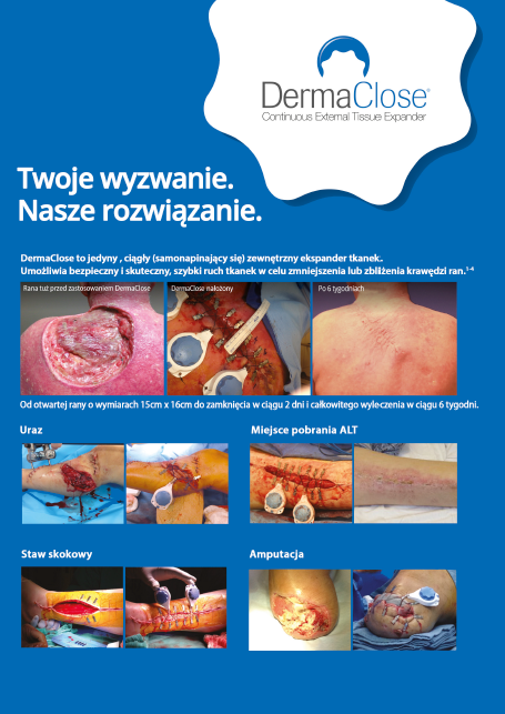 Ciągły, zewnętrzny ekspander tkanek DermaClose jest wskazany do stosowania w celu zmniejszania lub wspomagania zamykania ran pełnej grubości skóry. DermaClose to jedyny samozaciskający się zewnętrzny ekspander tkanek o kontrolowanej sile działania.